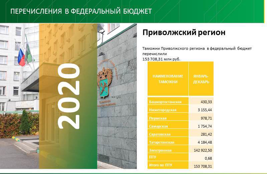 В 2020 году таможни Приволжского региона в доход федерального бюджета перечислили свыше 153 миллиардов рублей (153 708,31 млн руб.). В 2019 г. - 142 млрд рублей (142 598, 55 млн руб.).