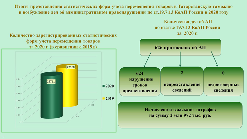 За непредставление или несвоевременное представление в таможенный орган статистической формы учета перемещения товаров (ст. 19.7.13 КоАП РФ) возбуждено 33 357 дел (29%), за нарушения валютного законодательства Российской Федерации и актов органов валютного регулирования (ст.15.25 КоАП РФ) возбуждено 8 220 дел (7,1%).