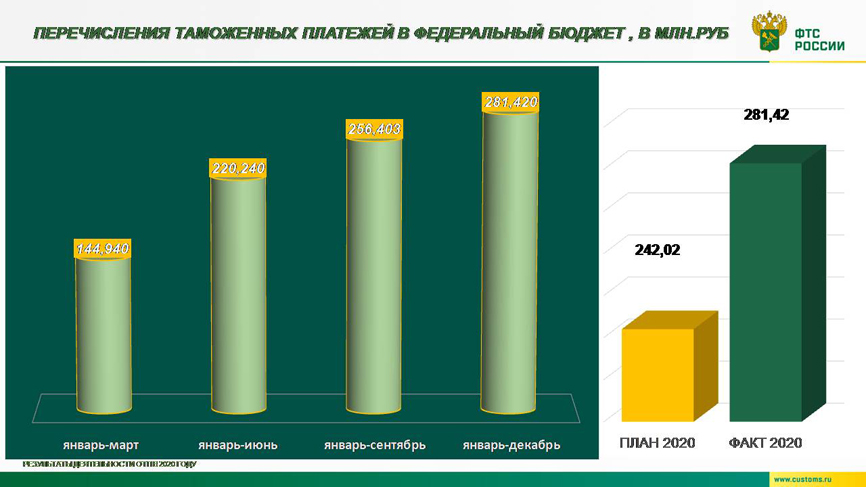 Информация об объемах взимания таможенными органами СЗТУ таможенных платежей в федеральный бюджет РФ в 2020 году