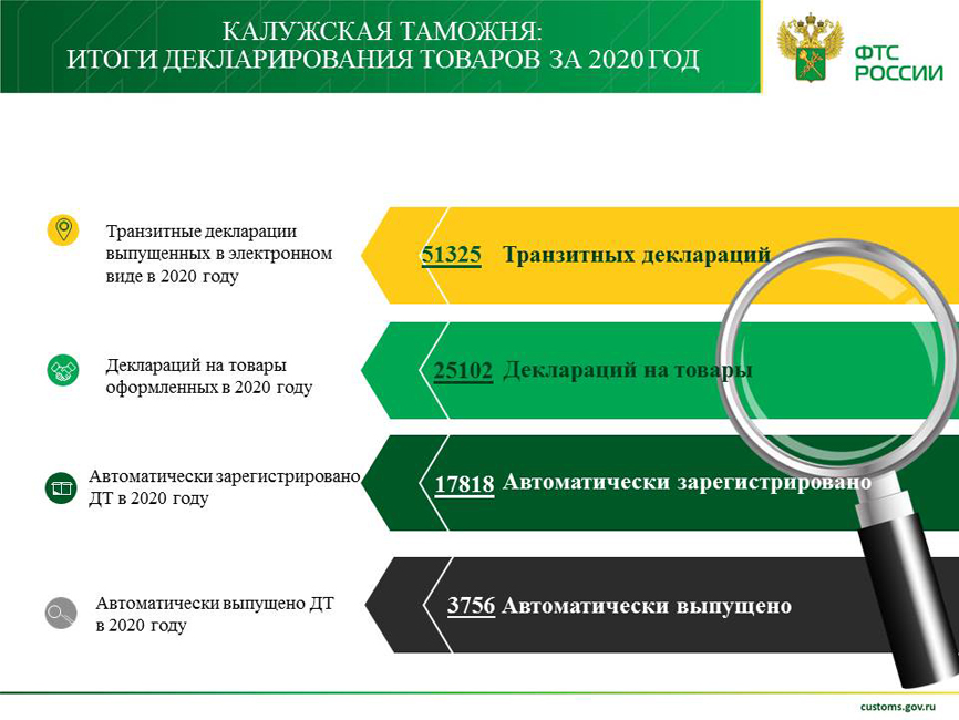 За 2020 Калужской таможней оформлено 25 102 деклараций на товары (далее – ДТ). Из них на экспортируемые товары подано 2759 ДТ, на импортируемые – 22 343 ДТ.