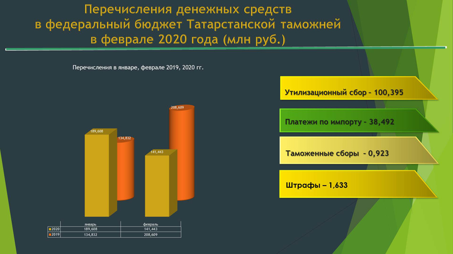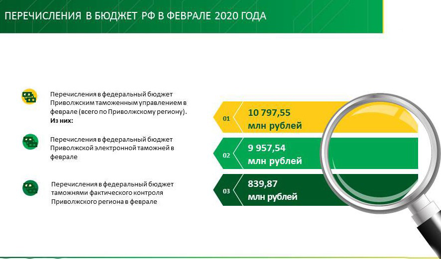 В феврале 2020 года Приволжское таможенное управление пополнило бюджет страны более, чем на 10 миллиардов рублей (10 797,55 млн руб). В феврале 2019 года перечисления составили 10 607,88 млн руб. По итогам февраля 2020 года большую часть средств перечислила Приволжская электронная таможня - 9 957,54 млн руб. Из таможен фактического контроля на первом месте Нижегородская таможня - 324,42 млн руб.