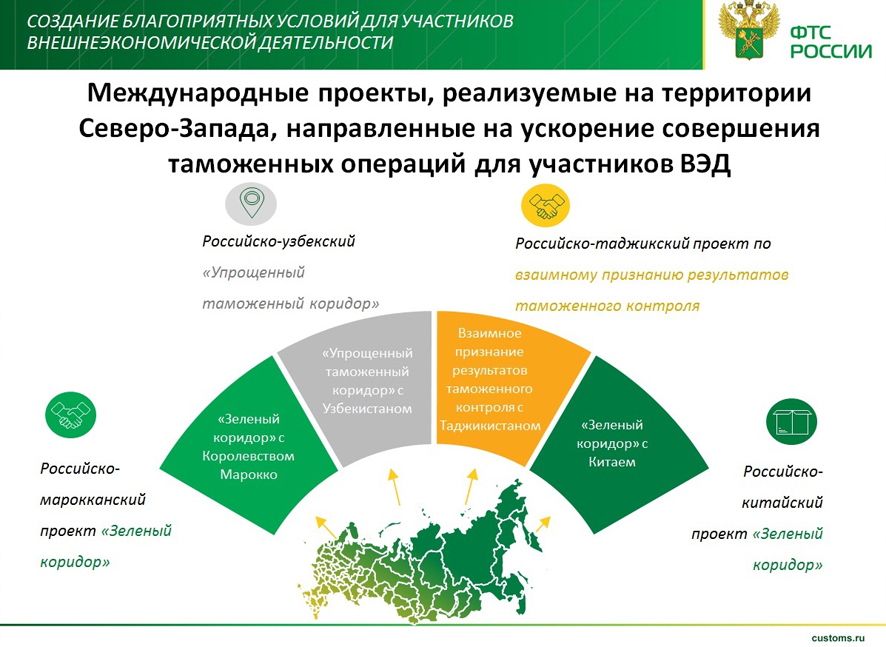 Спешим сообщить о возможности принять участие в международных проектах Российской Федерации по упрощению таможенных процедур «Зеленый коридор», «Упрощенный таможенный коридор» и «Взаимное признание результатов таможенного контроля в отношении определенных видов товаров» со следующими государствами: