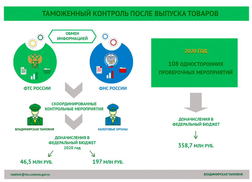 Технологии обмена данными совершенствуются и развиваются. При этом продолжается проведение односторонних проверок в рамках таможенного контроля после выпуска товаров. Так в 2020 году Владимирской таможней проведено 102 проверочных мероприятия, в результате которых в федеральный бюджет доначислены таможенные платежи, пени и наложены административные штрафы в сумме 312,2 млн рублей.