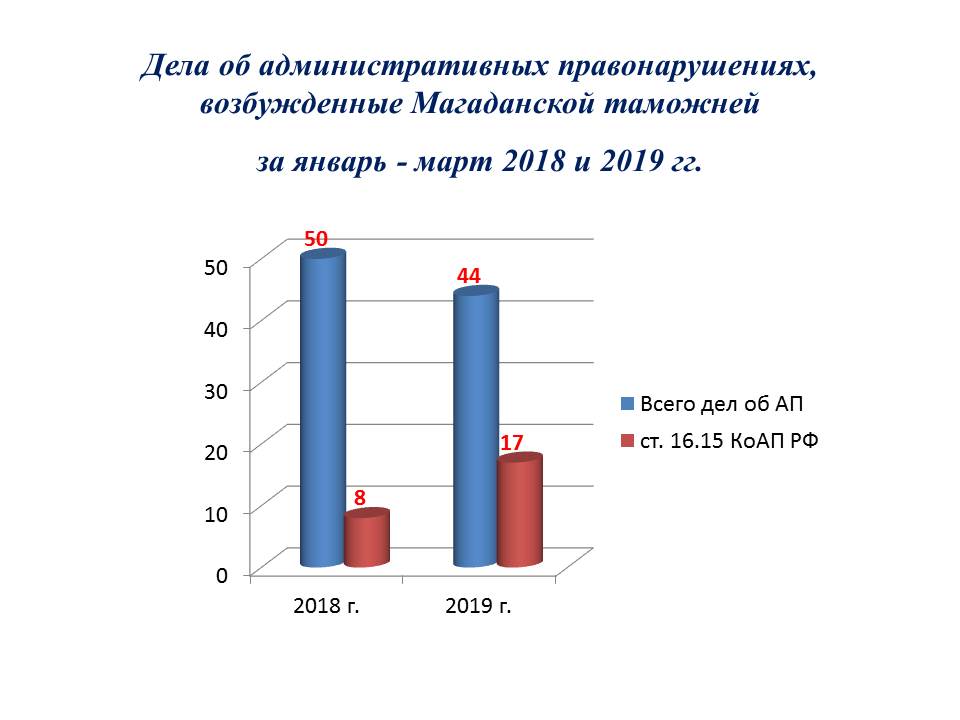 17 дел об административных правонарушениях возбуждено Магаданской таможней с начала 2019 года за непредставление либо нарушение порядка предоставления отчетности о товарах, помещенных под процедуру свободной таможенной зоны. Это почти в два раза больше, чем за 1 квартал 2018 года.