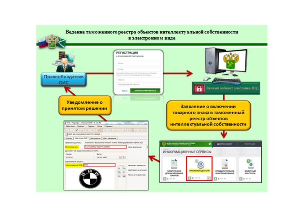 «Правообладатели». Сервис предоставляет правообладателю (или его представителю) возможность получить информацию о принадлежащих ему объектах интеллектуальной собственности, входящих в таможенный реестр, а также позволяет правообладателю в электронной форме взаимодействовать с таможенным органом, в том числе, для пресечения незаконного использования его товарных знаков.