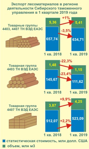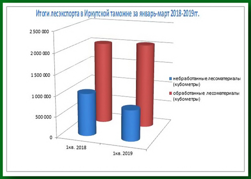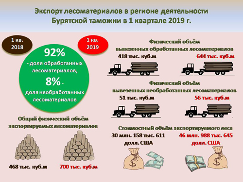 Всего в 1 квартале 2019 года через пункты пропуска Бурятской таможни (ЖДПП Наушки и МАПП Кяхта) было вывезено 700 тыс. кубометров экспортируемых лесоматериалов, общей стоимостью около 47 млн долларов США. По сравнению с тем же периодом 2018 года объём вывезенного леса увеличился на 33%, стоимостные показатели – на 35%.