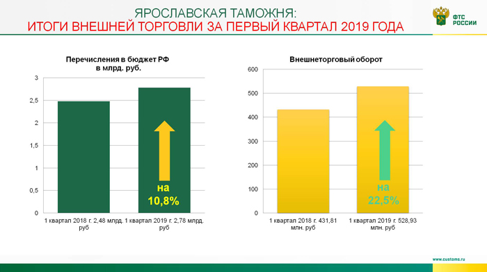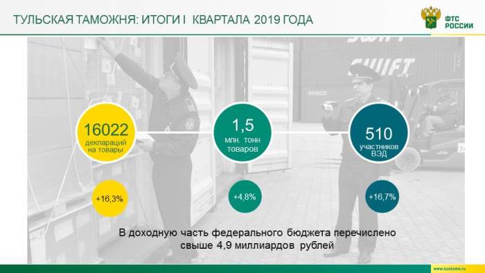 Подразделения таможенного контроля после выпуска товаров в 1 квартале 2019 года выявили ущерб, причиненный экономическим интересам государства в результате нарушений законодательства, на сумму 2,3 млрд руб. Проведено 519 таможенных проверок, результативность которых составила 95%. При этом произошло снижение административной нагрузки на бизнес: по сравнению с 1 кварталом 2018 года количество таможенных проверок сократилось на 32%.