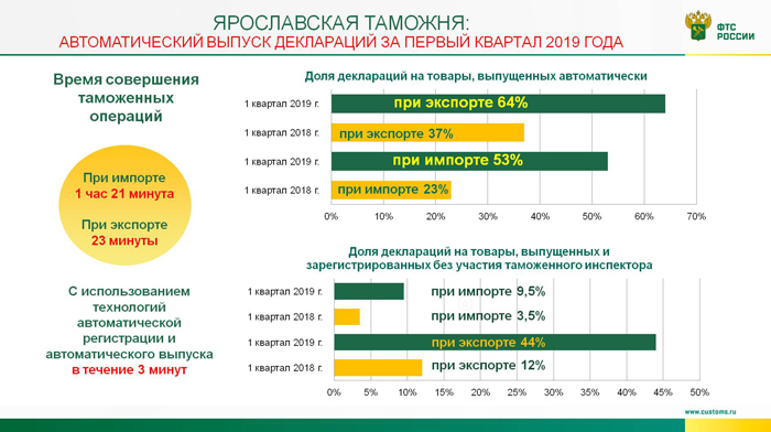 В течение 1 квартала 2019 г. в автоматическом режиме выпущены 33% экспортных и 24,5% импортных ДТ от общего количества деклараций, поданных участниками ВЭД низкого уровня риска (в аналогичном периоде прошлого года – 16,7% экспортных ДТ и 9,6% импортных ДТ).