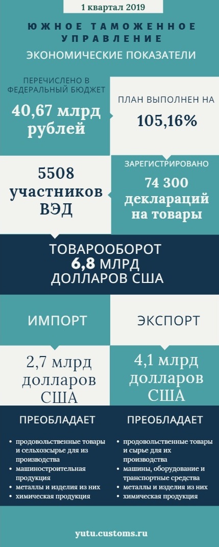 В регионе деятельности ЮТУ функционирует три центра электронного декларирования: Астраханский, Новороссийский и Ростовский. Все указанные таможенные посты включены в проводимый ФТС России эксперимент по концентрации таможенного декларирования в ЦЭД. По итогам 1 квартала 2019 г. в ЦЭД ЮТУ оформлено 64% всего декларационного массива региона (в аналогичном периоде прошлого года данный показатель составлял 25%). В течение года планируется расширение перечня таможенных органов, участвующих в данном эксперименте, путем включения отдельных таможенных постов региона, функционирующих в морских портах. Проводимые мероприятия по концентрации таможенного декларирования в ЦЭД позволят создать условия для развития функциональной специализации таможенных органов, сокращения сроков совершения таможенных операций и повышения эффективности таможенного контроля.