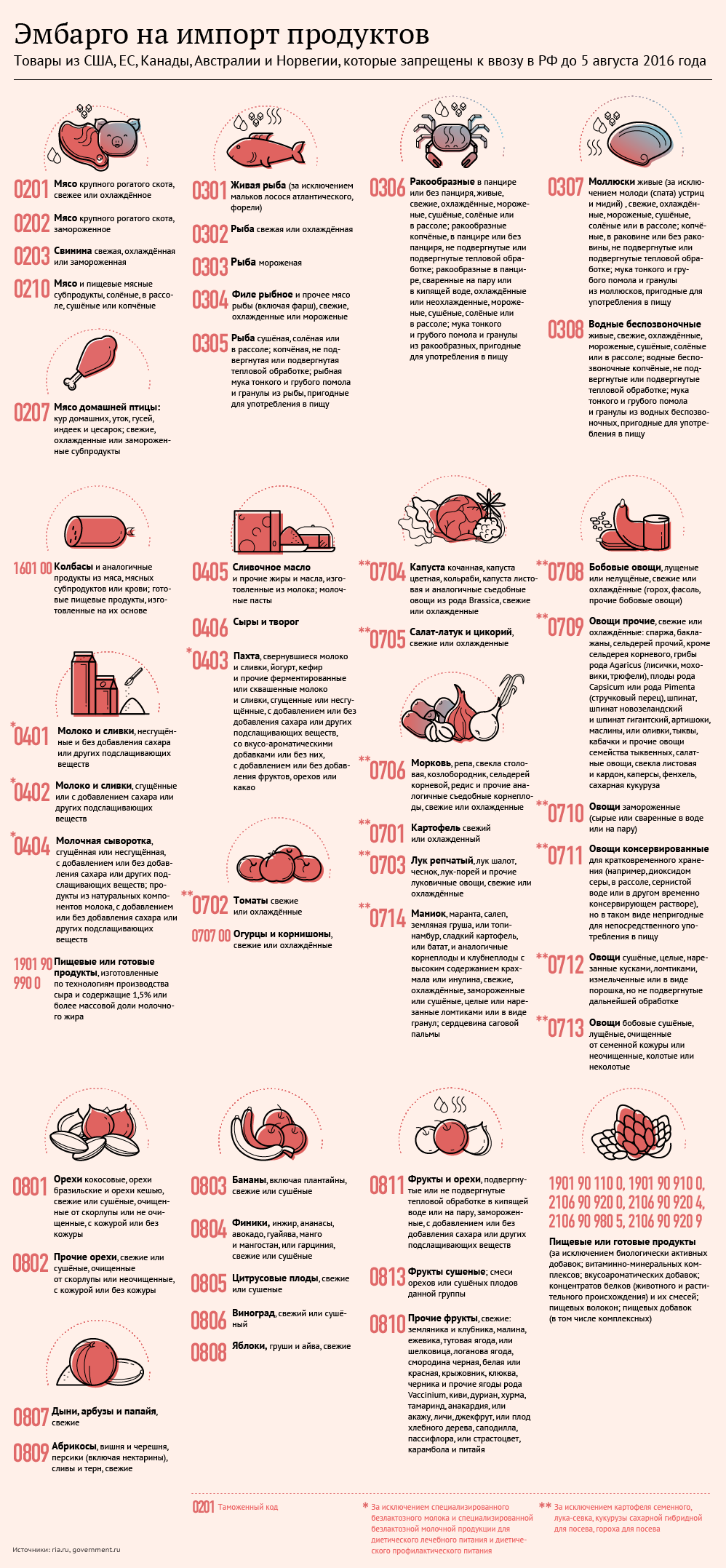 Этот запрет распространяется на ввоз сельскохозяйственной продукции, сырья и продовольствия, страной происхождения которых являются Соединенные Штаты Америки, страны Европейского союза, Канады, Австралии и Королевства Норвегия в соответствии с Постановлением Правительства от 25.06.2015 № 625 («О внесении изменений в постановление Правительства Российской Федерации от 07.08.2014 № 778).