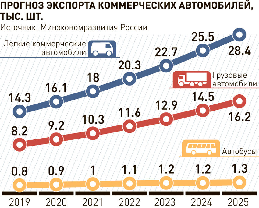 Промышленникам все еще приходится преодолевать последствия кризиса 2014-2016 годов, серьезно сократившего объемы экспорта в такие страны, как Украина и Казахстан. Принятая правительством в 2018 году Стратегия развития автопрома до 2025 года подразумевает рост уровня проникновения на рынки Ближнего Востока, Африки, Латинской Америки и Юго-Восточной Азии, чтобы компенсировать это падение. Сейчас продажи коммерческого транспорта за границу снова растут: по данным Российского экспортного центра и Федеральной таможенной службы, за восемь месяцев 2019 года в денежном выражении объем поставок на 32 процента выше, чем годом ранее: 448 миллионов долларов против 339,3 миллиона.