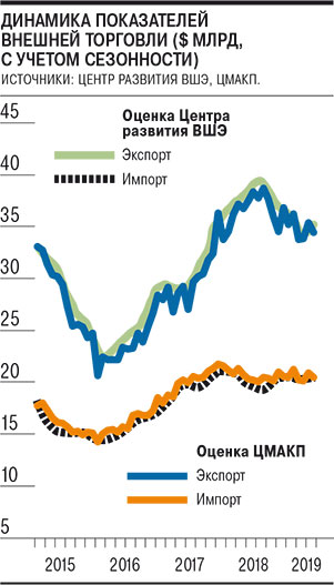 Хотя август важен для понимания направления движения экспорта, говорить о вероятном переломе его динамики можно будет по данным минимум трех кварталов. Пока же даже оценки Центра развития ВШЭ свидетельствуют, что за восемь месяцев (август 2019 года к декабрю 2018 года) внешнеторговый оборот уменьшился на 4,2%, экспорт — на 7,3%, импорт увеличился на 1,7%, а положительное сальдо торгового баланса сократилось на 17,3%. При этом внешнеторговый оборот со странами ЕC снизился на 6,9%, с Китаем — на 1,9%, с США — на 2,1%. «Динамика экспорта обусловлена главным образом динамикой цен на мировом энергетическом рынке. Падение мировых цен на нефть в ноябре 2018 — августе 2019 года (на 25,1%) стало причиной уменьшения объемов экспорта. На динамику импорта продолжали влиять спросовые ограничения на отечественных рынках товаров потребительского и инвестиционного назначения»,— поясняют авторы исследования. На этом фоне за первые восемь месяцев 2019 года экспорт высокотехнологичной продукции увеличился на 23,9%, а ее импорт — около двух третей общего объема импорта — сократился на 0,3%.