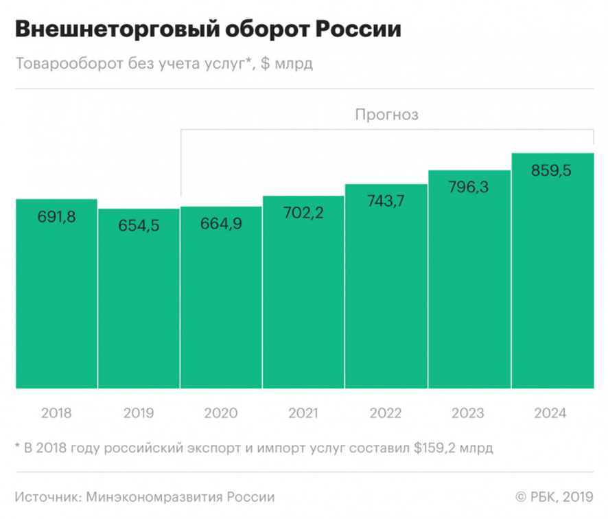 План Минэкономразвития означает, что к 2024 году рубль сравняется с долларом и евро по доле в российской внешней торговле или опередит одну из этих валют (по всей вероятности, постепенно теряющий свои позиции доллар). В 2024 году внешняя торговля России товарами и услугами в эквиваленте по меньшей мере $300 млрд будет вестись в российских рублях, следует из предложенного министерством KPI.
