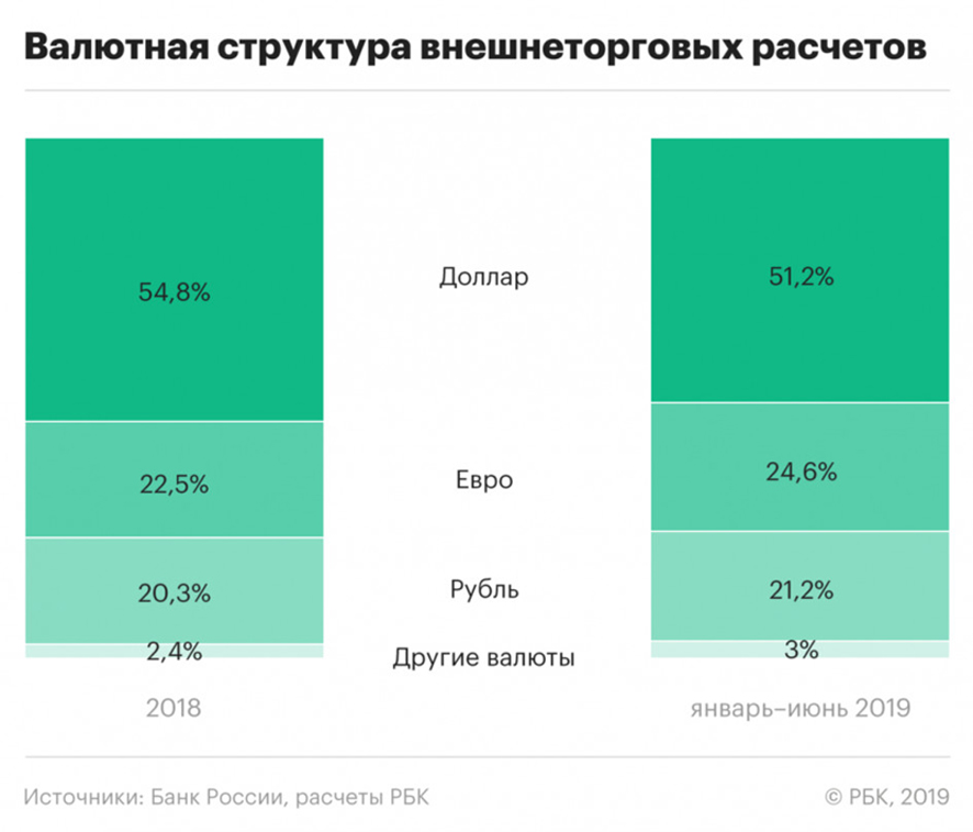 Доллар по-прежнему господствует во внешнеторговых расчетах России с долей 51,2% в первом полугодии 2019 года, но его роль последовательно снижается (за весь 2018 год было 54,8%). Доля евро, наоборот, растет: с 22,5% в 2018 году до 24,6% в первой половине текущего года.