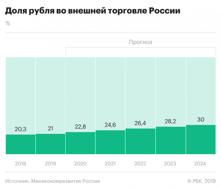 Увеличение доли рубля во внешней торговле до 30% к 2024 году — «слишком амбициозная задача для текущих реалий», считает Донец. «Это высокие цифры, их будет трудно добиваться. С другой стороны, опыт с расчетами в евро показывает, что там, где есть политическая воля, ситуация может развиваться гораздо быстрее, чем предполагают экономисты», — пояснила она. Расчеты в рублях прежде всего возможны со странами ближнего зарубежья, зоной ЕАЭС, уточнила эксперт.