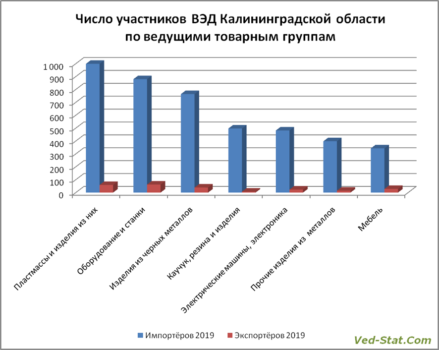Число компаний-участников ВЭД по всей России рекордно, на 18%, увеличилось в 2018 году. И хотя за 6 месяцев 2019 года уже роста не наблюдается, общее число внешнеторговых компаний Калининградской области составило 2654, из них импортёров – 2401 и экспортеров 348. По информации Аналитической Группы «ВЭД-Стат», наибольшее число участников ВЭД привлекают импорт и экспорт товаров из пластмассы, подробные данные приведены на сайте компании. 1000 компаний произвели ввоз в Россию пластмассовых изделий (вывезли – 59). Немногим меньше, 880 импортеров, завезли станки и оборудование, экспортёров по данной позиции больше – 62. Третье место по популярности занимают изделия из черных металлов. В 1 полугодии 2019 года 785 участников занимались их импортом, и 39 – экспортом.