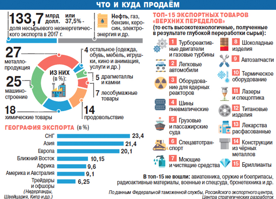 Накануне Петербургского международного экономического форума (ПМЭФ) проект по развитию несырьевого неэнергетического экспорта получил статус национального проекта. ПМЭФ в 2018 году стал основной площадкой для обсуждения будущей стратегии центрального звена нацпроекта — группы Российского экспортного центра (РЭЦ). Ему предстоит не только координировать работу по созданию нацпроекта, но и превращать работу всех его участников в единый и согласованно работающий экономический механизм. Он будет включать в себя не только поддержку экспорта, но и региональное развитие, регуляторные изменения, и в том числе инновационный процесс, развитие цифровой экономики и привлечение инвестиций. Задача по достижению несырьевым экспортом из России уровня в $250 млрд в год до 2024 года выглядит решаемой только в том случае, если изменится сама экономика.