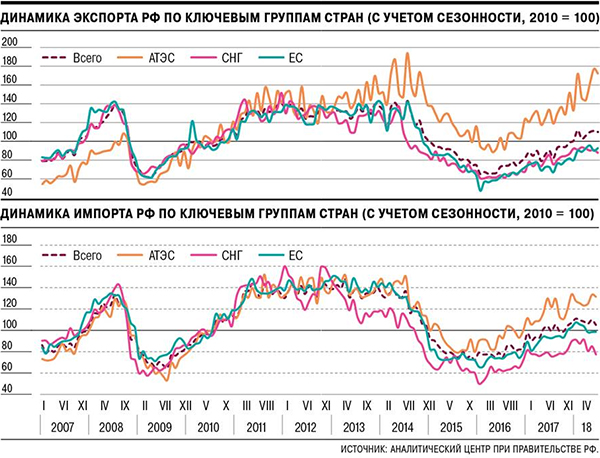 Хотя, по данным Федеральной таможенной службы, сейчас доля ЕС и США во внешнеторговом обороте России несколько меньше 50% (43,8 и 3,6% соответственно за первые шесть месяцев 2018 года), опрошенные RT эксперты также говорят о невозможности достигнуть столь высокой отметки в ближайшее время.