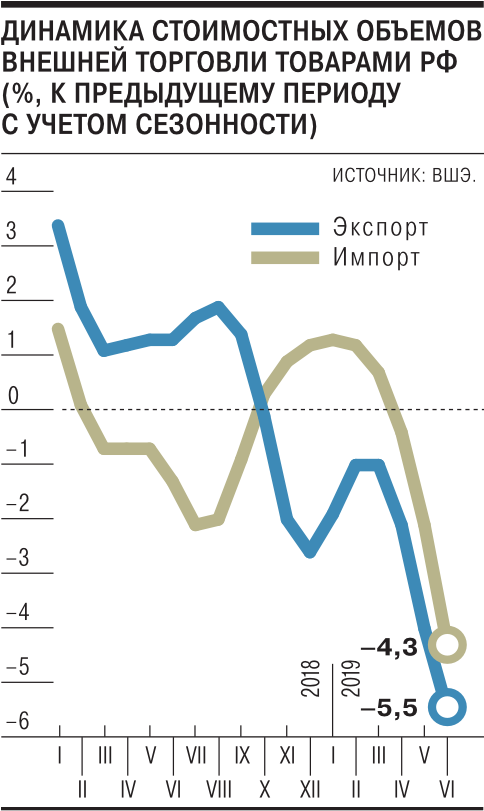 Банк России и независимые эксперты зафиксировали увеличение стоимости импорта с учетом сезонности, притом что вплоть до июня 2019 года аналитики, напротив, говорили об его снижении (см. “Ъ” от 11 сентября). По оценкам Центра развития (ЦР) ВШЭ, стоимость ввозимых из дальнего зарубежья товаров увеличивалась все лето: на 0,6% (месяц к месяцу) в июне, на 2,5% в июле и на 0,6% — в августе. В июне и июле этому способствовало укрепление рубля (на 0,3% и 1,5% за месяц в реальном выражении), но и в августе, несмотря на значительное ослабление рубля (на 2,8%), импорт не снизился, как это было год назад, отмечается в опубликованном вчера выпуске «Комментариев о государстве и бизнесе». По оценкам же аналитиков департамента исследований и прогнозирования ЦБ (ДИП), импорт после очистки от сезонности в июле—августе превысил средний уровень второго полугодия 2018-го — первого полугодия 2019 года, но оставался ниже локальных пиков второго полугодия 2017-го — первого полугодия 2018 года.