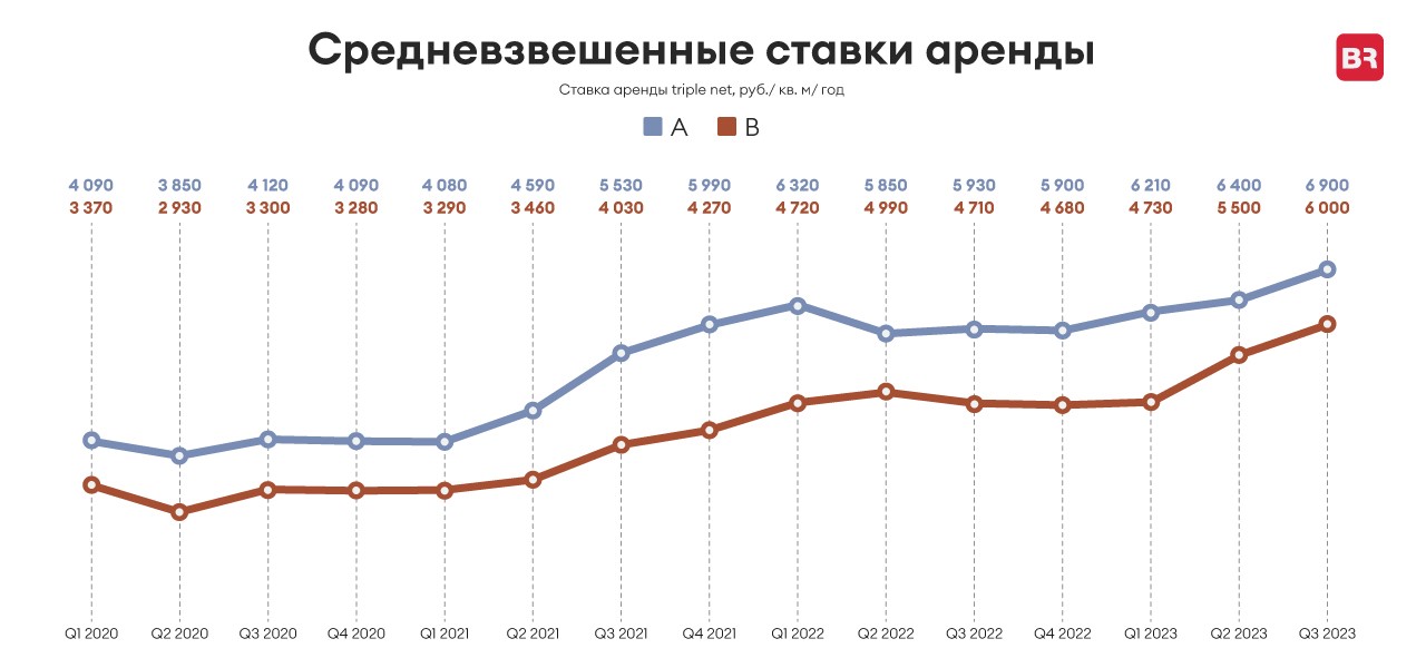По оценкам NF Group, ставка аренды на будущее предложение (включая built-to-suit проекты) класса А соответствует 140 $/кв. м/год, на спекулятивные площади класса B – 92 $/кв. м/год. Стоимость услуг логистических компаний по ответственному хранению груза с I квартала выросла на 26,8% и к концу сентября 2023 года достигла 123 $/кв. м/год.