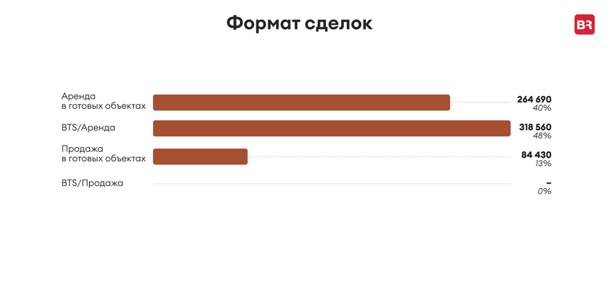 Лидирующим форматом сделок за 1-3 кварталы 2023 г. традиционно оказалась аренда, на нее пришлось порядка 84% от общего объема сделок за январь-сентябрь. Объем сделок продажи составил 84 430 кв. м. При этом здесь мы говорим о продаже готовых объектов. В структуре аренды доли сделок как в готовых объектах, так и в объектах BTS, то есть таких, которые реализуются под конкретного заказчика, оказались практически одинаковыми – 40% и 48% соответственно.