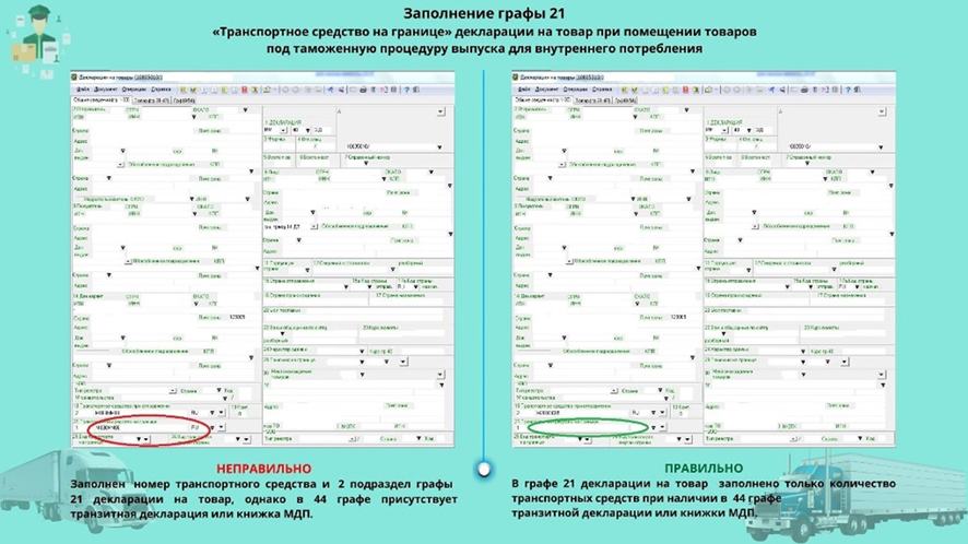 2. Заполнение графы 21 «Транспортное средство на границе» декларации на товар при помещении товаров под таможенную процедуру выпуска для внутреннего потребления.