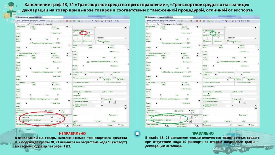 1. Заполнение граф 18, 21 «Транспортное средство при отправлении», «Транспортное средство на границе» декларации на товар при вывозе товаров в соответствии с таможенной процедурой, отличной от экспорта.