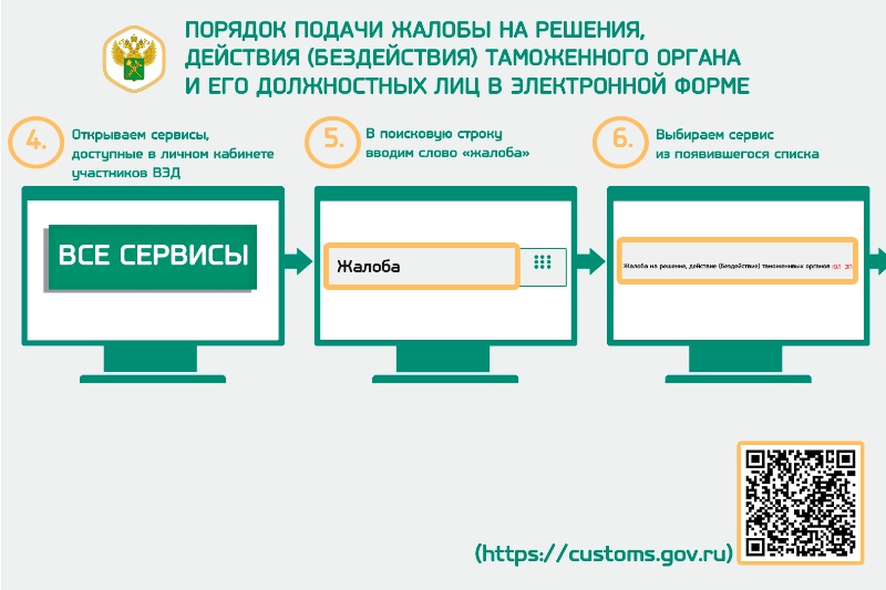 В ведомстве обратили внимание, что подать жалобу в электронном виде можно только через личный кабинет на сайте ФТС России https://customs.gov.ru. По электронной почте не предусмотрена подача жалоб на решение, действие (бездействие) таможенного органа.