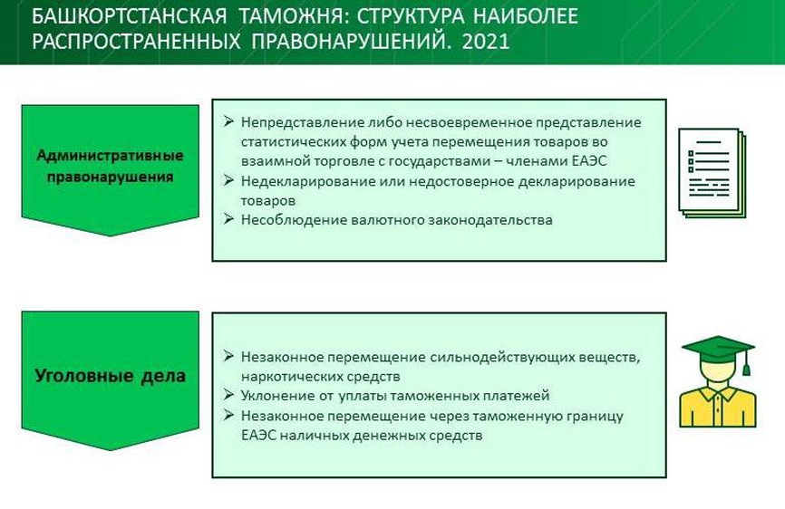Наиболее совершаемыми административными правонарушениями в прошлом году стали непредставление либо несвоевременное представление в таможенные органы статистических форм учета перемещения товаров во взаимной торговле с государствами – членами ЕАЭС, недекларирование или недостоверное декларирование товаров, несоблюдение валютного законодательства. Структуру уголовных дел сформировали факты незаконного перемещения сильнодействующих веществ, наркотических средств, уклонения от уплаты таможенных платежей, незаконного перемещения через таможенную границу ЕАЭС наличных денежных средств.